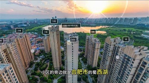 可以点击这个图标就进入到这个小区的VR全景,大家可以看到小区的旁边就是合肥市的蜀西湖,而且奥特莱斯商场、银泰百货都在旁边。这个小区的绿化率大概在40%,容积率大概是3。这个小区的楼栋还是比较高的,而且外立面基本上是以黄色为主,楼间距也不是很大,所以低层的用户采光就可能受到一些影响。