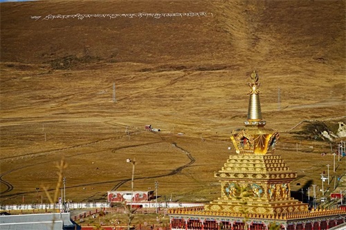 亚青寺,位于四川省甘孜藏族自治州白玉县阿察镇昌托村,距县城120公里、距镇政府19公里,海拔约4000米,属藏传佛教宁玛派。设有寺庙管理委员会,负责管理寺庙事务。远处的上坡上有大大的白色文字,我猜是藏语吧,有人知道是什么意思吗,欢迎大家评论区指教。