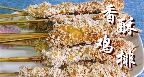 5、然后用竹签把鸡胸肉串起来,再把串好的鸡胸肉裹上面包糠。锅烧热后到入色拉油,等油温升至六七成热把鸡胸肉串,放入锅中,因为竹签比较长,油里没炸到的地方用勺子把热油浇在上面