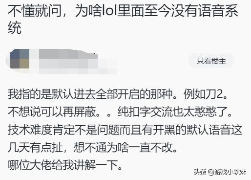玩家疑惑,LOL为什么没有DOTA2那种默认全部开启的语音呢?玩家在游戏中只有打字交流也太浪费时间了,想要开发语音系统应该也要不了很大的技术投入,想不通为什么一直没有。