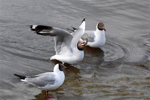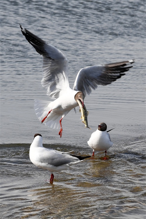 6月29日,在刚察县泉吉河内,一只棕头鸥(中)捕捉到湟鱼。 新华社记者 范培珅 摄