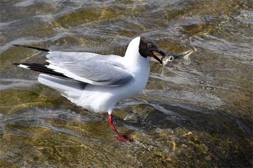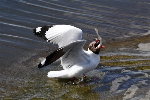 6月29日,在刚察县泉吉河内,一只棕头鸥捕捉到一条湟鱼。 新华社记者 范培珅 摄
