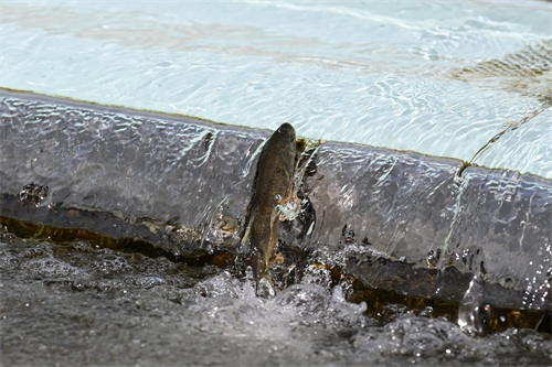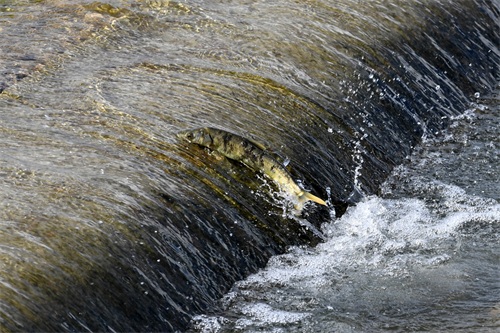6月29日,在刚察县泉吉河内,湟鱼跃起向上洄游。 新华社记者 范培珅 摄