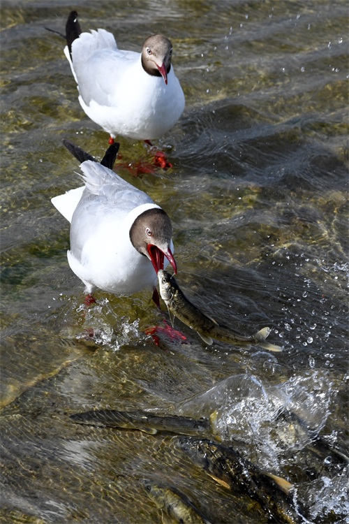 6月29日,在刚察县泉吉河内,棕头鸥在捕捉湟鱼。 新华社记者 范培珅 摄