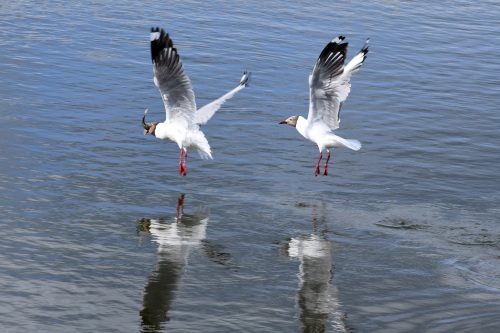 6月29日,在刚察县泉吉河内,一只棕头鸥(左)捕捉到湟鱼后飞离水面。 新华社记者 范培珅 摄