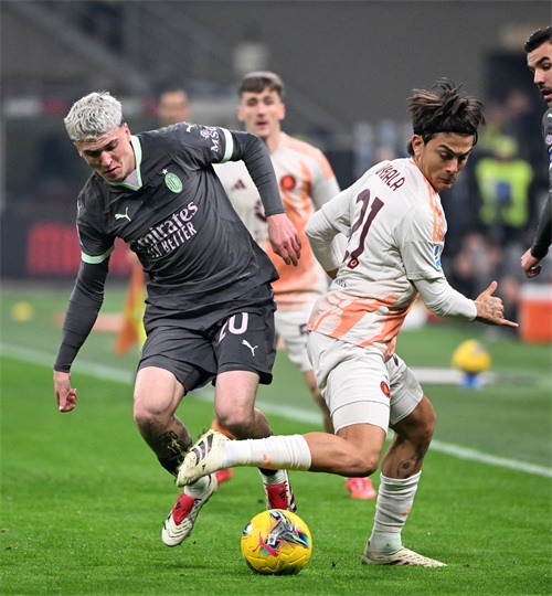 12月29日,AC米兰队球员希门尼斯(左)与罗马队球员迪巴拉在比赛中拼抢。 新华社发(阿尔贝托·林格利亚摄)