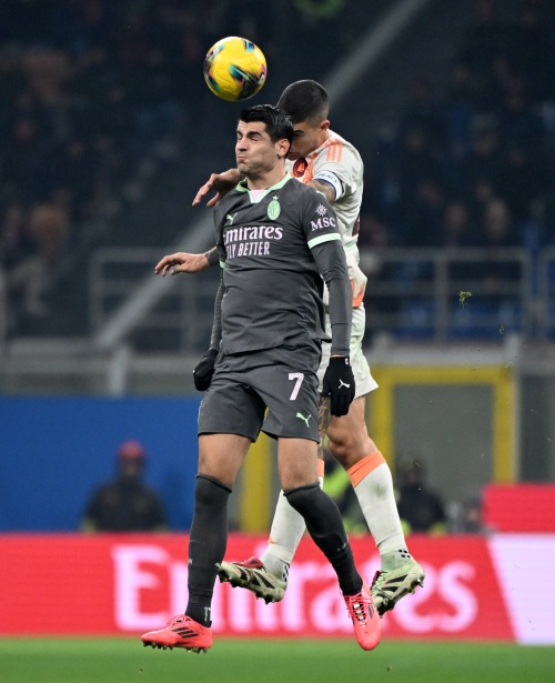 12月29日,AC米兰队球员莫拉塔(左)与罗马队球员曼奇尼在比赛中拼抢。 新华社发(阿尔贝托·林格利亚摄)