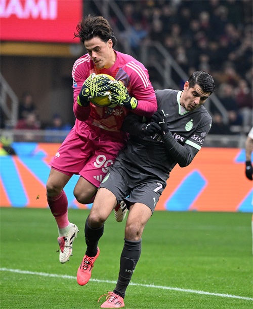 12月29日,AC米兰队球员莫拉塔(右)与罗马队门将斯维拉尔在比赛中拼抢。 新华社发(阿尔贝托·林格利亚摄)