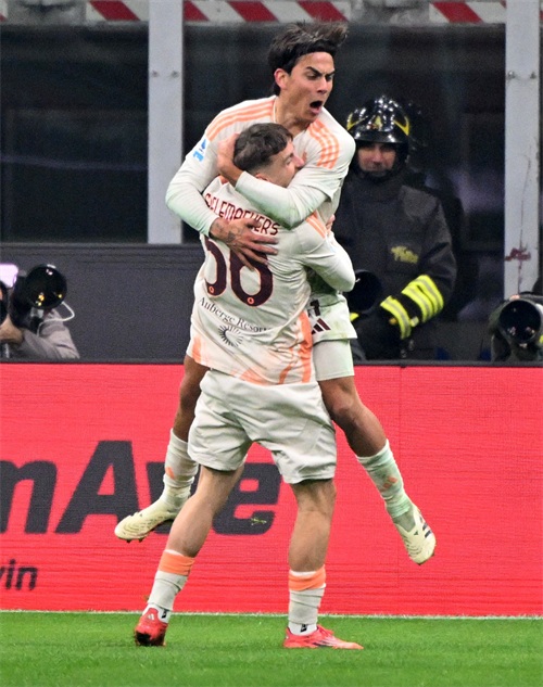 12月29日,罗马队球员迪巴拉(上)与队友萨勒马克尔斯庆祝进球。 新华社发(阿尔贝托·林格利亚摄)