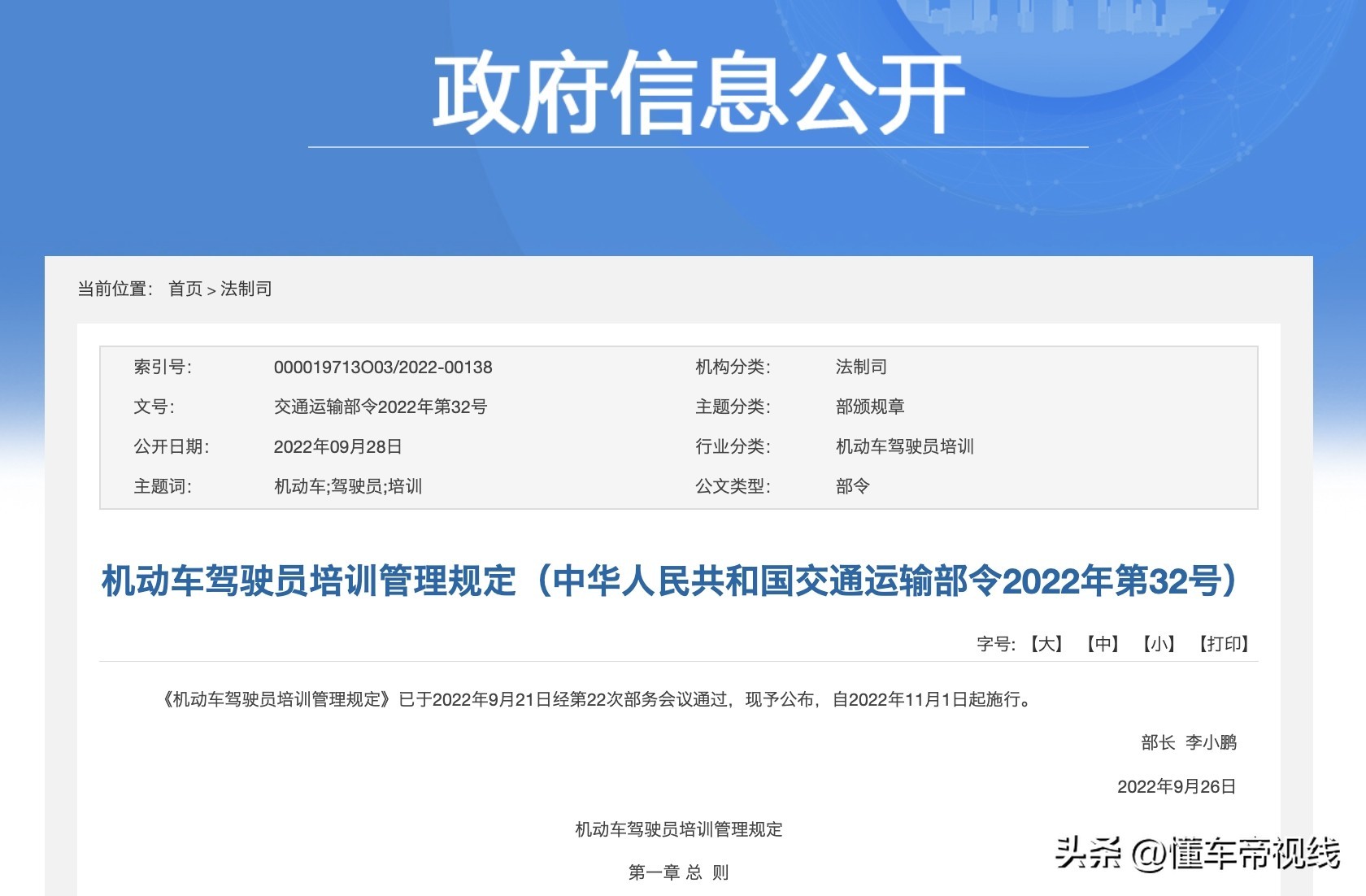 据了解,在今年10月27日,交通运输部办公厅发布《关于做好〈机动车驾驶员培训管理规定〉贯彻实施工作的通知》。通知中提到,为贯彻落实《国务院关于修改和废止部分行政法规的决定》(国务院令第752号)关于机动车驾驶培训许可调整为备案等部署要求,交通运输部修订颁布了《机动车驾驶员培训管理规定》,自2022年11月1日起施行。