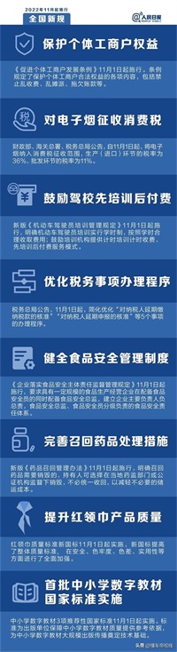 [懂车帝原创 行业] 10月31日,据环球网消息,11月起,一批与生活息息相关的新规施行。其中涉及个体工商户权益保护、优化税务事项办理、食品药品安全,鼓励驾校提供先培训后付费服务以及地方外商投资条例等等。