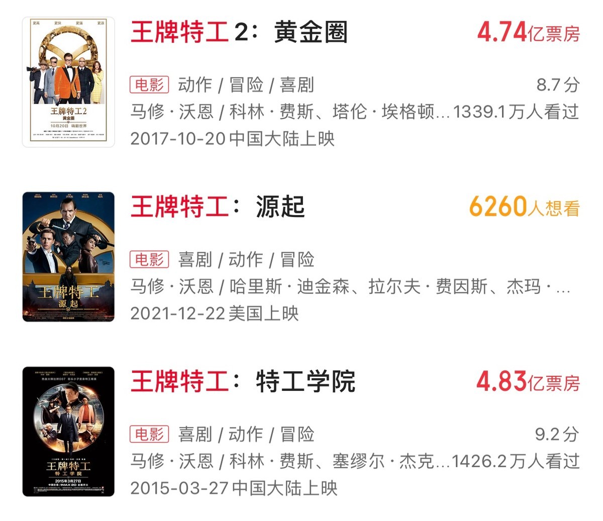 据猫眼专业版统计,《王牌特工》系列前作的内地总票房为9.57亿。