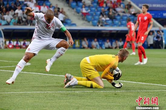 北京时间6月19日凌晨,俄罗斯世界杯小组赛G组突尼斯与英格兰的较量在伏尔加格勒打响。开场第11分钟,阿什利扬开出角球,斯通斯高高跃起头球攻门,突尼斯门将哈桑奋力扑救,但凯恩门前补射破门,英格兰队1-0领先。