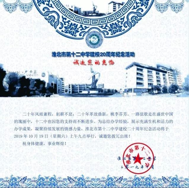 淮北市第十二中学建校20周年纪念活动将于10月19日上午九点在该校举行,诚邀广大校友届时重返母校,师生故旧相聚一堂,追忆往昔情深。