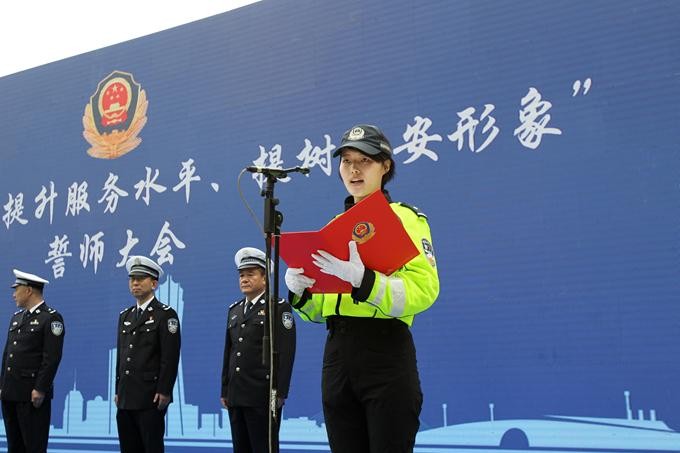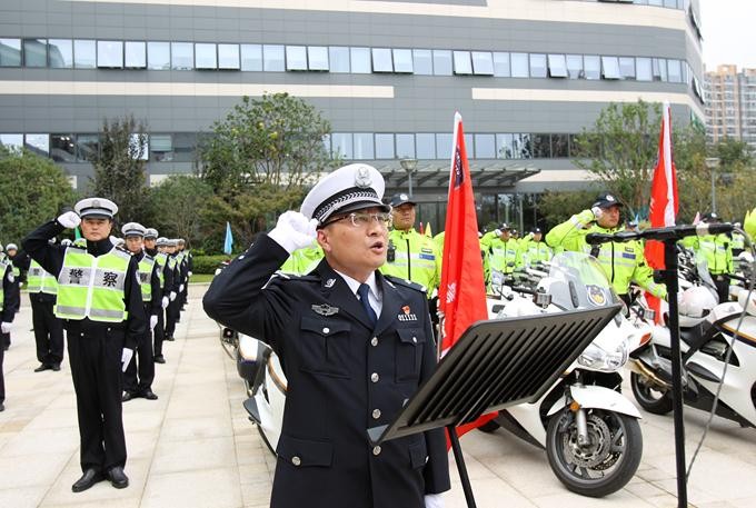 11月5日下午,杭州市公安交警 在杭州市职工文化中心广场举行“提升服务水平、提树公安形象”誓师大会。现场执勤交警、协辅警、TPTU队员等三个方阵近两百人共同庄严宣誓:“牢记使命,忠诚履职。解放思想,对标一流。干在实处,走在前列。提升服务,提树形象。锻造铁军,看我交警!”