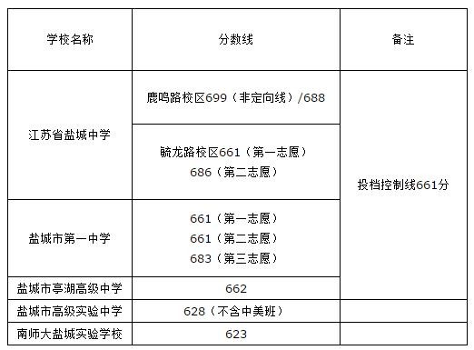 学校名称分数线盐城市田家炳中学586盐城市伍佑中学595盐城市龙冈中学624盐城市时杨中学538盐城市大冈中学559盐城市明达中学爱心班587盐城市南洋中学实验班574盐城经济技术开发区中学如东中学班604