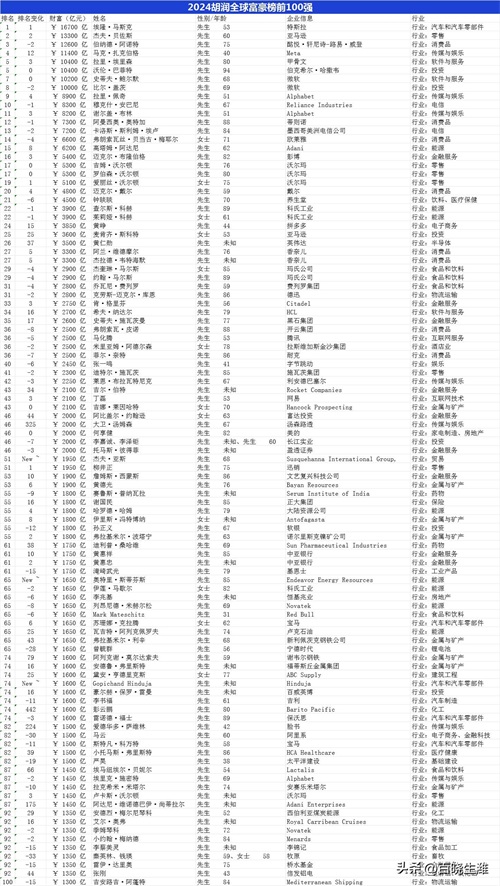 2024胡润全球富豪榜前100富豪名单!8位万亿富豪!亚洲首富归印度