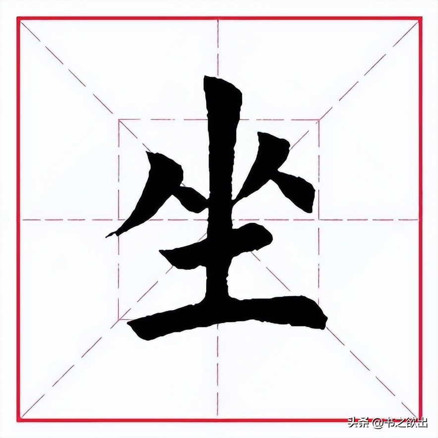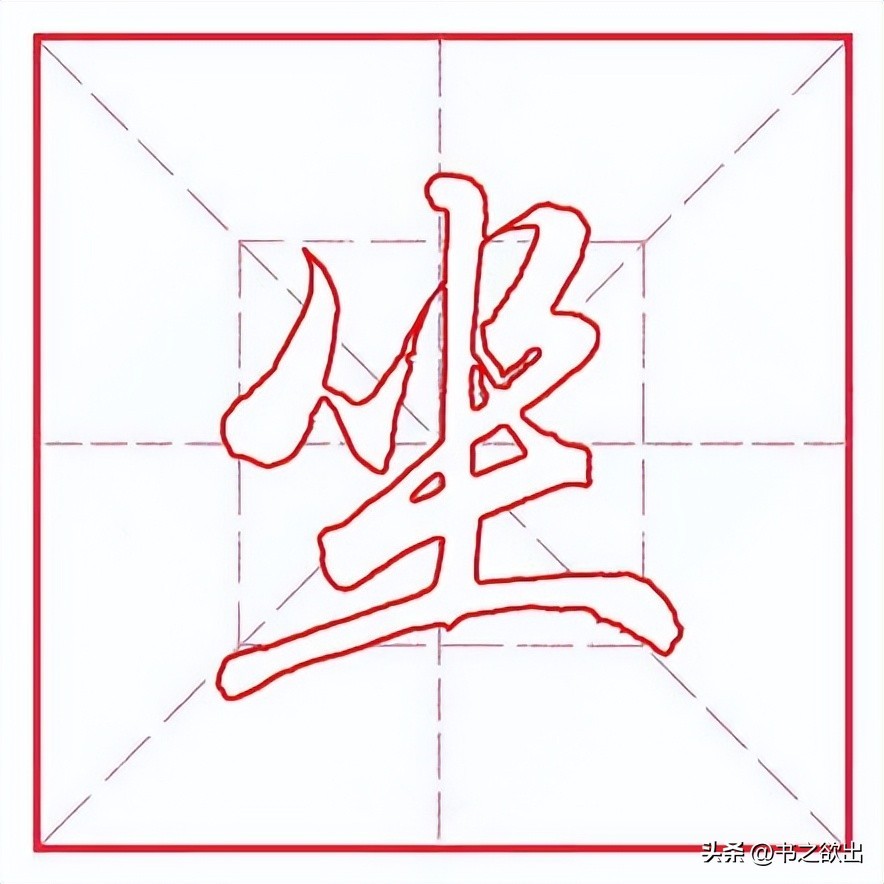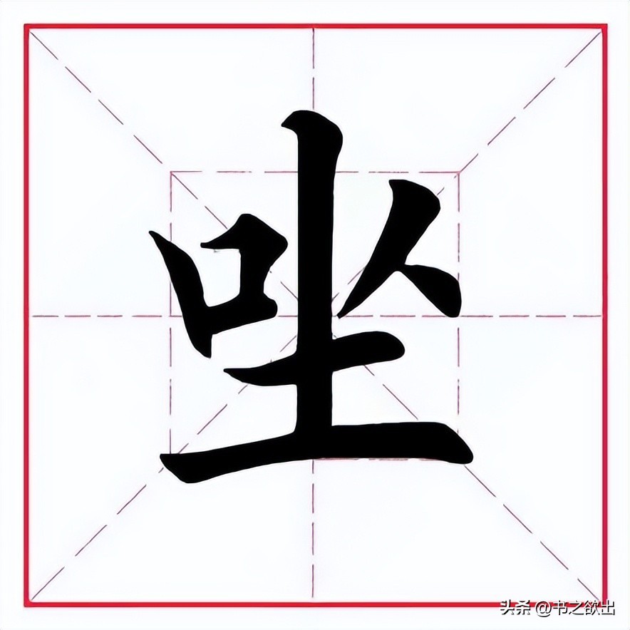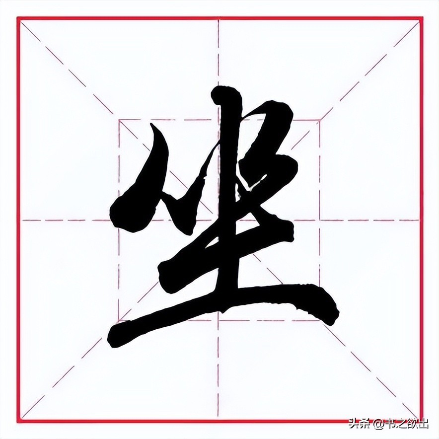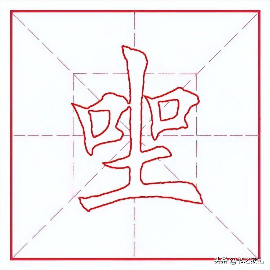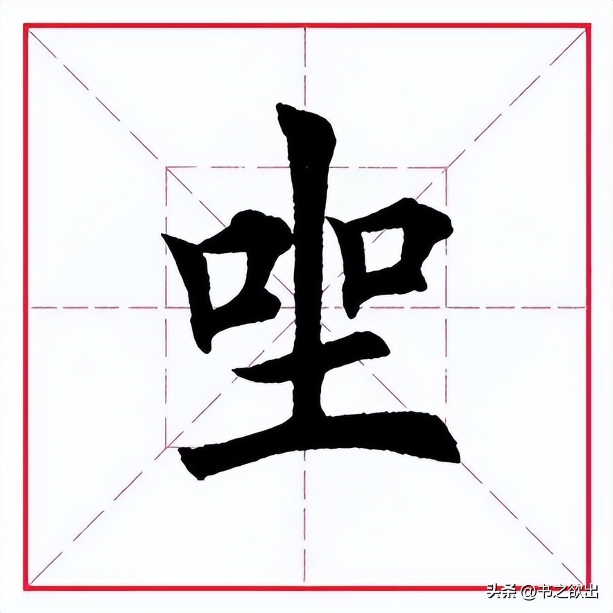 下面“土”字上靠,首横勿重,注意起笔的位置,抗肩;竖笔高扬,以平切落笔,稍重,然后转中锋向下直行,行笔略轻,从两个“口”字的中间穿过,挺直有力,过横画后行笔勿长;最后底横起笔左探,左边抗肩,中间稍轻,右部略平,收笔稍下压,使其略呈拱形,稳住整字。