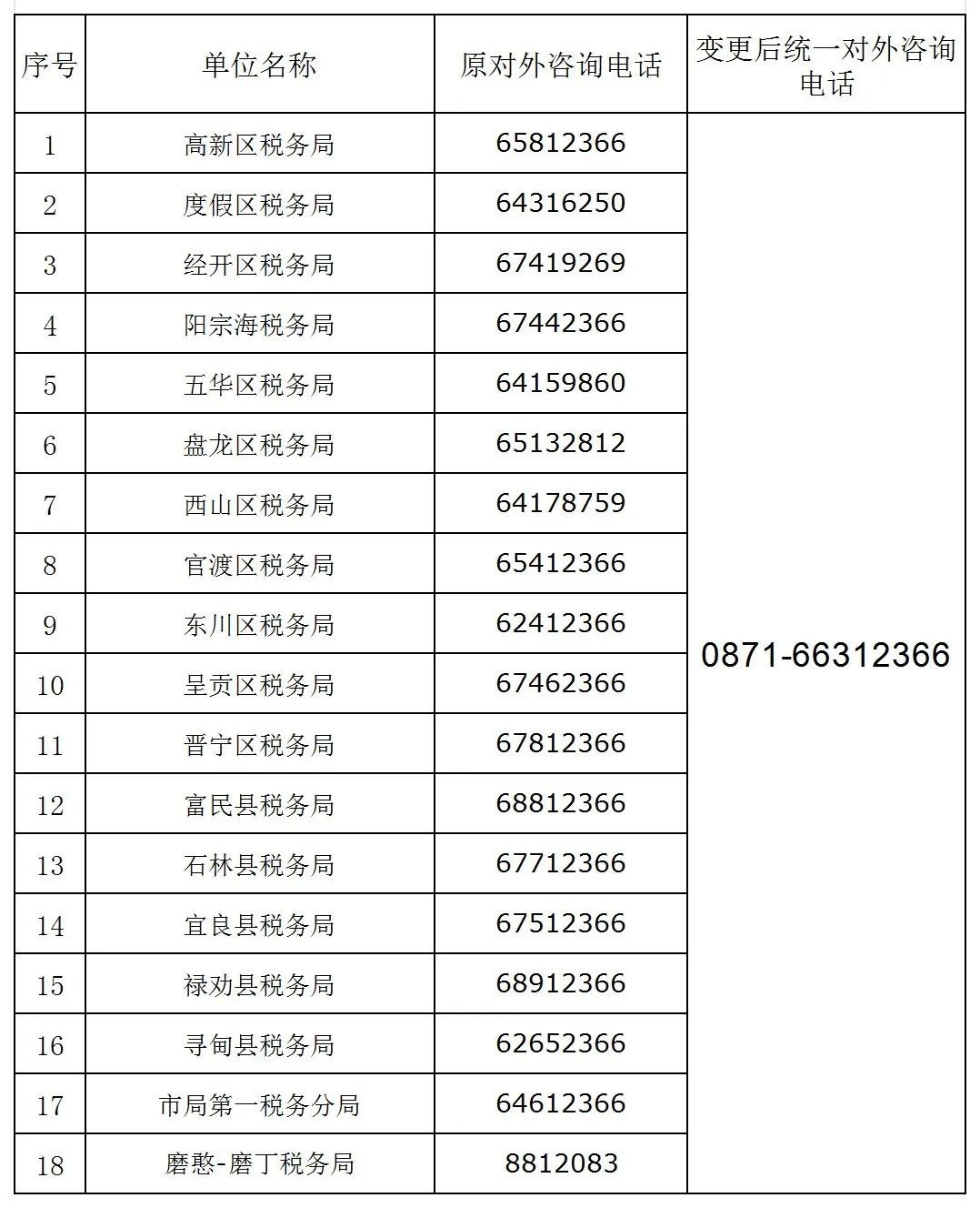 为深入贯彻落实中办、国办《关于进一步深化税收征管改革的意见》有关要求,积极构建“集约化、专业化、标准化”税费服务支持体系,进一步优化办税缴费服务流程,提升办税缴费服务体验,国家税务总局昆明市税务局拟对全市办税服务厅对外公开咨询电话(见附件)进行整合,设立统一的对外公开咨询电话,电话号码:0871-66312366。该号码于2024年2月1日起正式运行(对外公开咨询电话服务时间:法定工作日9:00-12:00 13:00-17:00)。2024年2月1日起,原办税服务厅对外公开咨询电话正式停用。