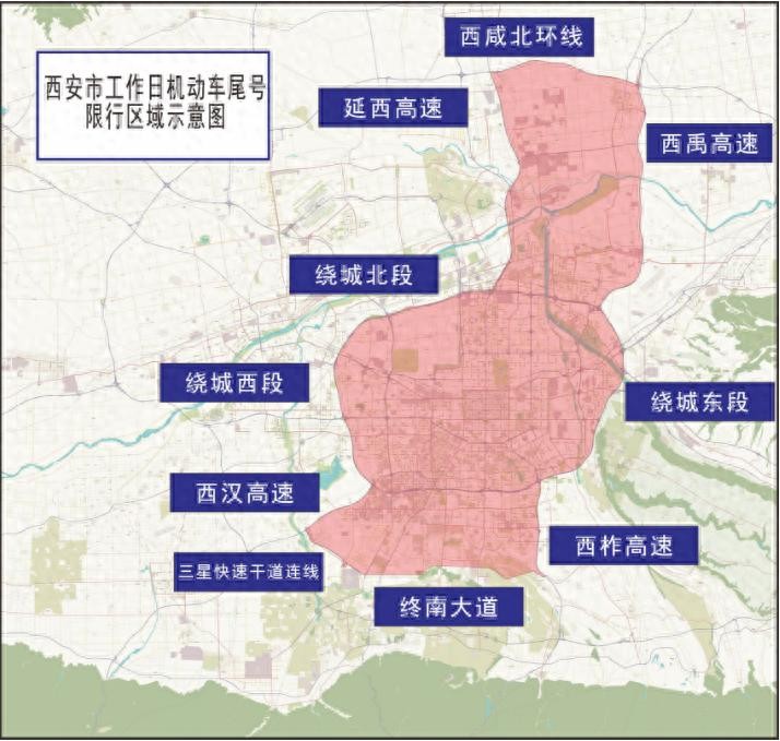 西安市行政区域内,以西安绕城高速以内区域为中心,向南扩展至终南大道、堰渡路、三星快速干道连线(不含)以北,西汉高速以东、西柞高速以西围合区域;向北扩展至西咸北环线(不含)以南、延西高速以东、西禹高速以西围合区域。