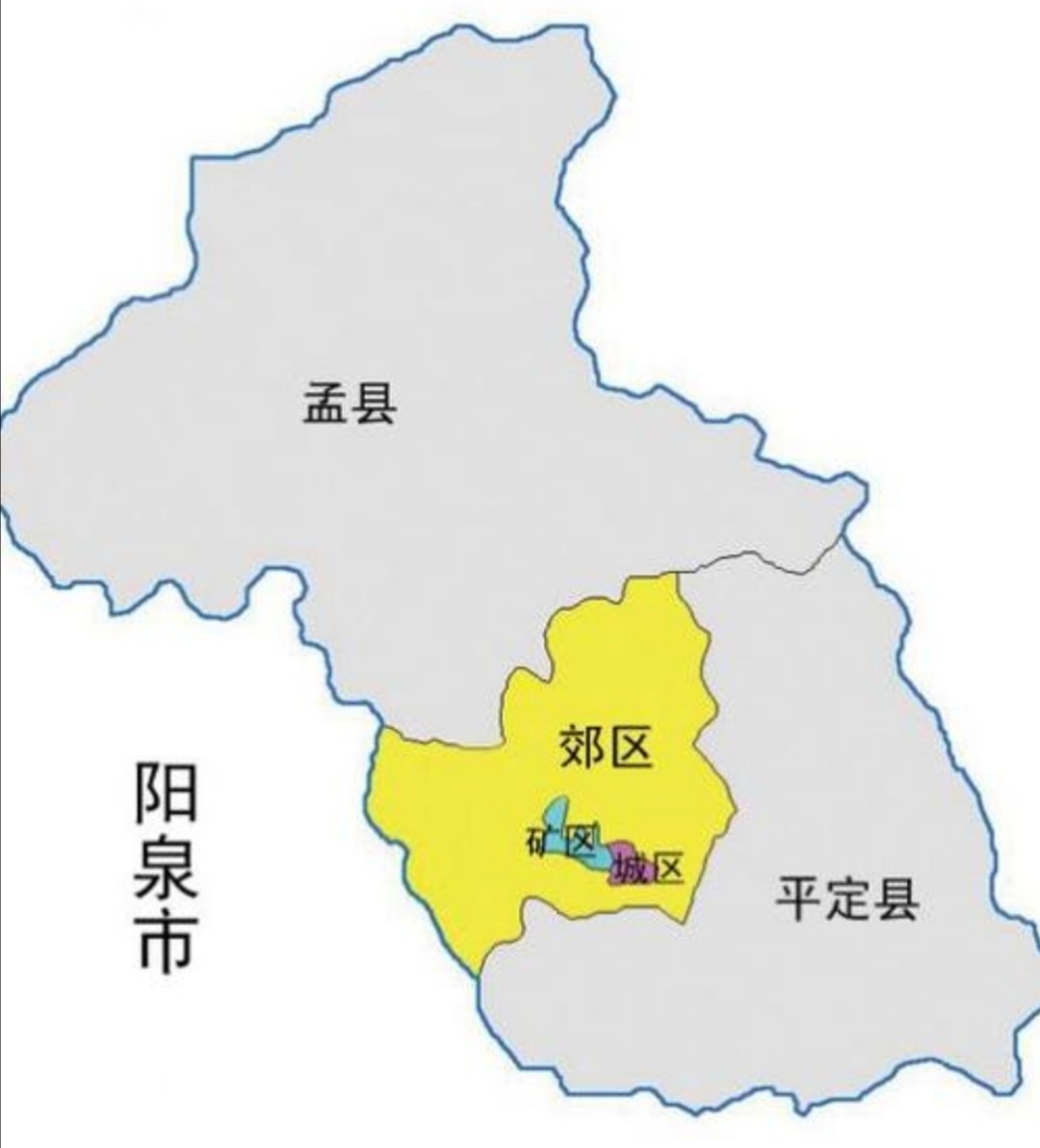 阳泉市辖3个区、2个县。3个区为:城区、矿区、郊区,2个县为:盂县、平定县。