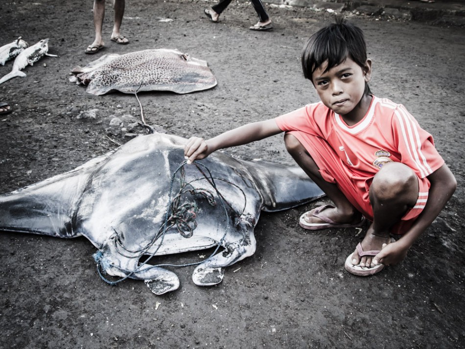 当地小男孩悲伤地看着这条死去的双吻前口蝠鲼。随着当地蝠鲼数量的减少,渔民们已经将目标转向那些幼年的蝠鲼。