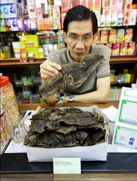 在一家滋补品商店里,店主正在展示所销售的蝠鲼鱼鳃。虽然《濒危野生动植物种国际贸易公约》一直将蝠鲼列为保护对象,但经济价值的推动下杀戮从未停止。