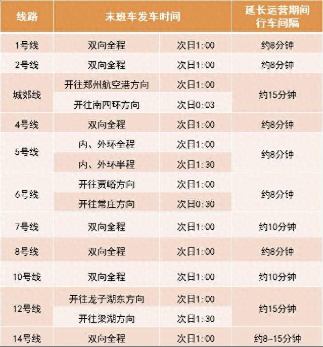 2024年12月31日跨年夜,郑州地铁线网运营时间延长至次日1:00,各线路末班车发车时间及行车间隔详见下表。