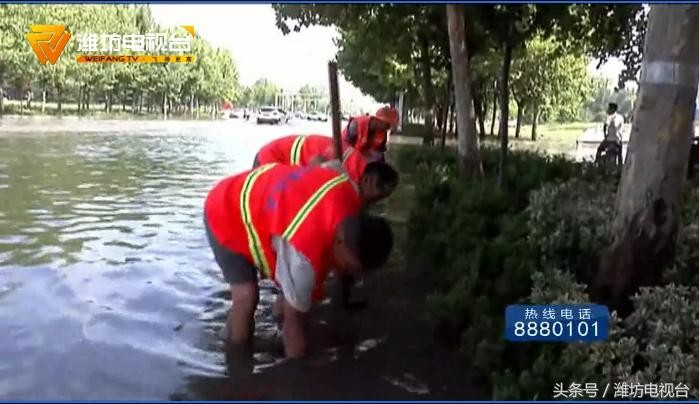 诸城市政部门紧急排查疏导,确保短时间内排除积水,畅通市民出行环境。在积水深处,几十名工作人员正在作业,他们用铁锹,或者直接用手来清理堵在下水口的垃圾。