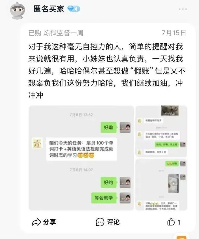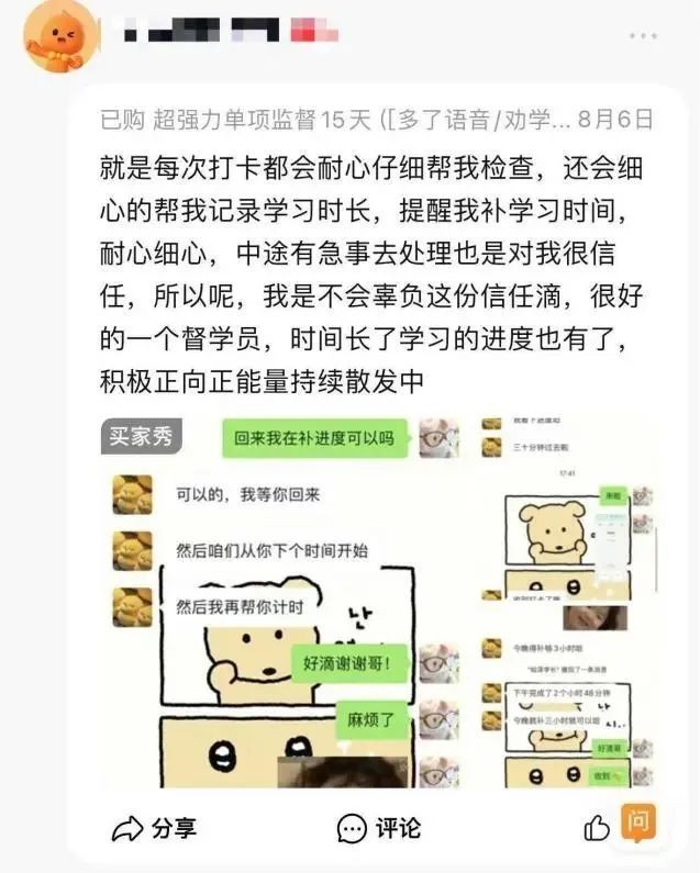 浏览这类服务的售后评论可以发现,这类线上“督学”的监督员并非冷冰冰的机械打卡,“耐心”、“温柔”、“亲切”、“认真负责”等是在评论区反复出现的评价。