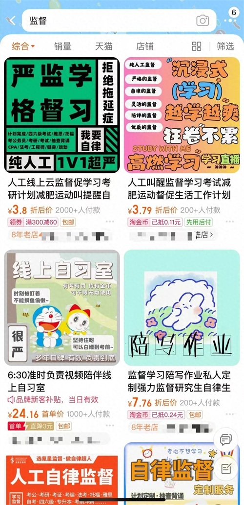而这类线上“督学”的价格,最便宜的单日体验打卡监督为七八元,昂贵的特聘老师全面监督一个月超千元,有的店铺仅一项服务的月销量就能达到2000+。