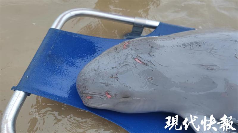 现场,这条长约 1 米,体重三四十斤,头部较圆,吻部较短,没有背鳍,浑身呈现灰色的江豚头上和身上有着明显的伤痕,被搁浅在礁石上的江豚身体不停来回扭动,为防止它再次受到伤害,消防队员小心翼翼地将它转移到担架上。