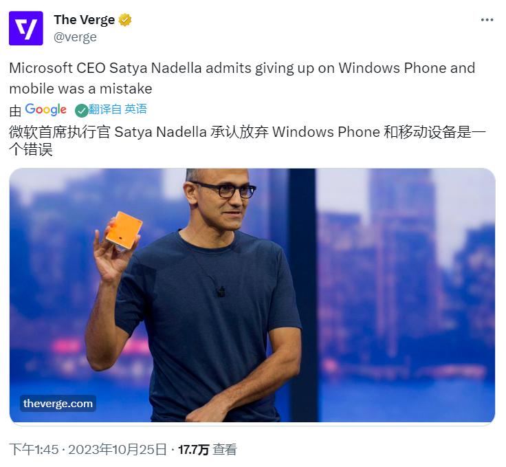 直到最近,微软 CEO 纳德拉在接受采访时承认,放弃 Windows Phone 和移动设备是一个错误。