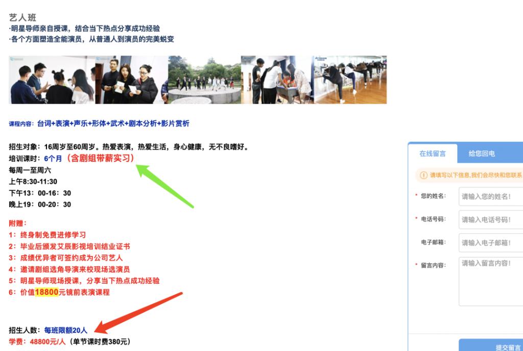就上述公开信息来说,该机构确实存在知名演员或者是专业表演老师教学的班级,也存在包进剧组的案例,但前提是学员需要缴纳 "4 万 +、8 万 +" 的学费才能享受到这一待遇,而那些缴纳 "8 千 +、1 万 +" 学费的学员并没有这类课程,只能进行初级的表演训练。