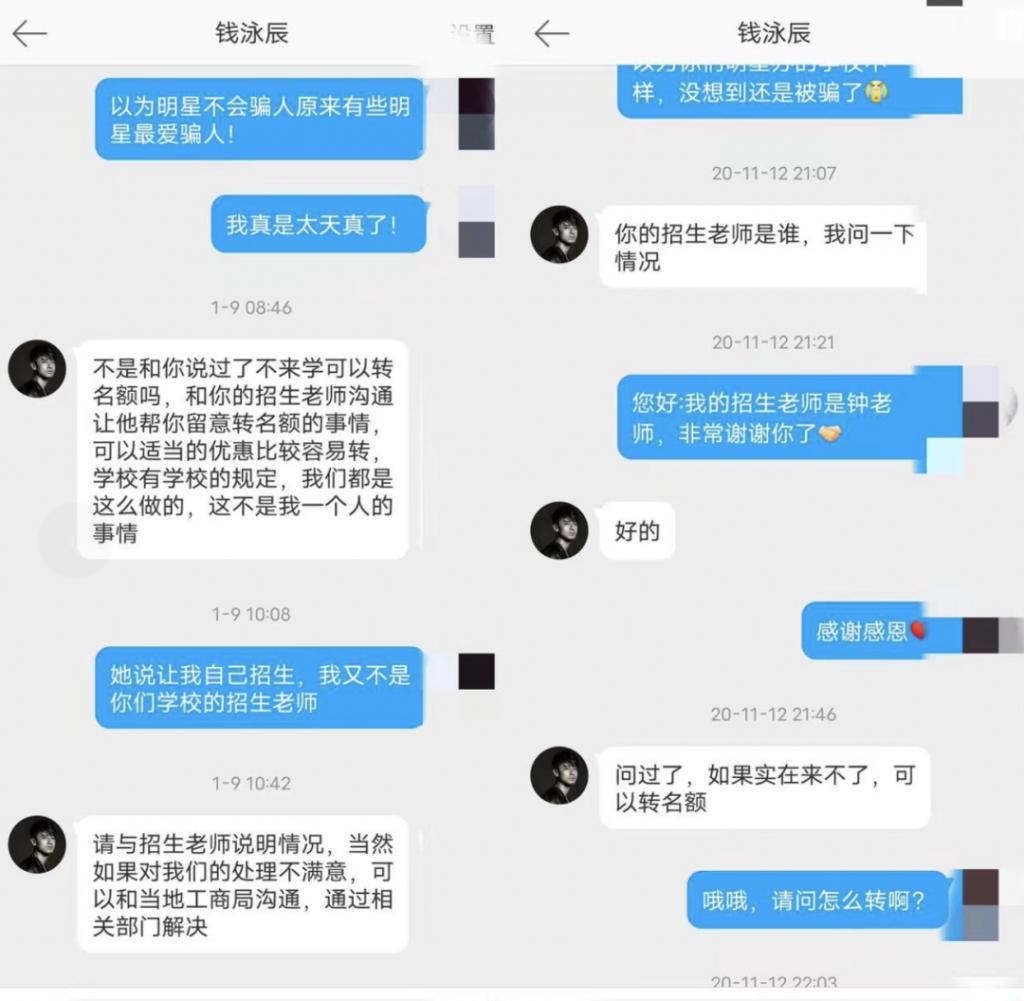 第三位接受采访的学员是于 2025 年在一次与钱泳辰的见面会上报的名,她说道:" 当时因为明星在所以头脑一热交纳了 12000 元的定金,钱泳辰还给我签了名,事后后悔了才发现机构拒绝退还定金,还表示如果不想上课可以将名额转让给其他人。"