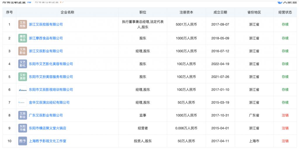 记者查询发现,公众号艾辰影视的关联公司为金华艾辰演出经纪有限公司隶属于钱石义名下。据天眼查 App 显示,钱石义共关联有 10 家企业,其中 7 家为存续状态,包括浙江艾辰控股有限公司、浙江艾辰影业有限公司、金华艾辰演出经纪有限公司、东阳市艾辰影视培训有限公司、东阳市艾扮美容服务有限公司等。