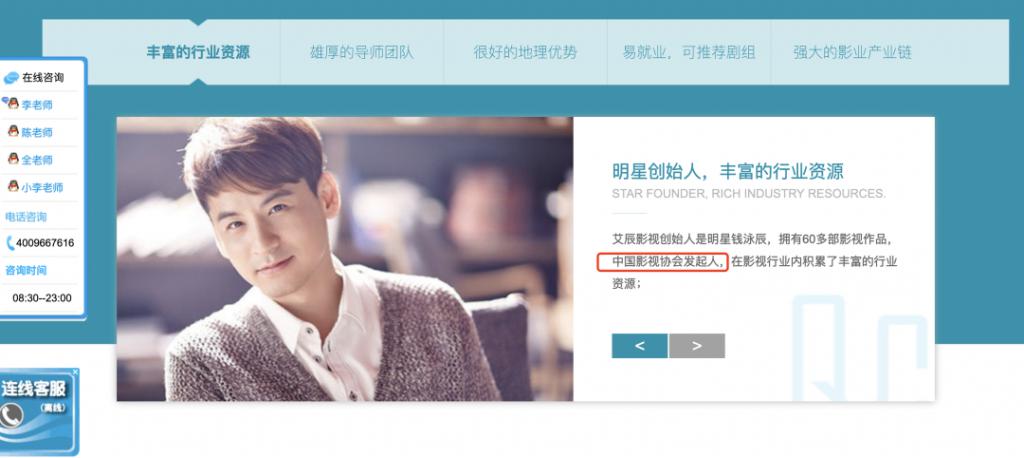 据艾辰影视官方微信公众号介绍,该培训机构是由影视明星钱泳辰创办,是 " 浙中地区唯一一家专业影视艺人包装、推广、培训为一体的演出经纪公司 "。值得一提的是,其介绍中称已为国内各大剧组塑造了一批具有专业演技和艺术气质的明日之星。
