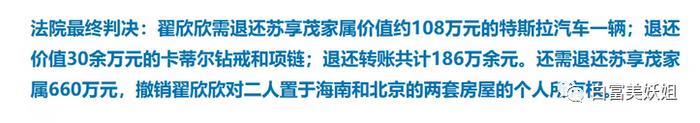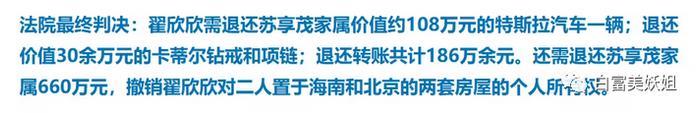 5年后,法院判决翟欣欣返还苏享茂家属近千万的财产,撤销其在海南和北京两套房屋的个人所有权。