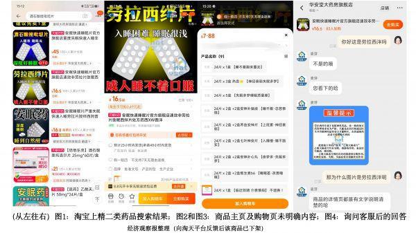 在淘宝平台上搜索劳拉西泮、阿普唑仑、酒石酸唑吡坦等临床治疗焦虑症或抑郁症的药品名称,会发现商家在商品封面图中展示的是上述精神药品的名称,但是在购物车页面,商品名称只标注了 "24 片 x1 盒 / 多盒 ",不展示图片及名称。只能在商品详情页的最底部或咨询客服时发现,实际销售的是另一款乙酰天麻素片——一种主要用于治疗神经性头痛的非处方药,允许有资质的店铺出售。