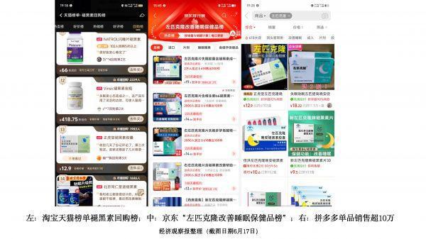 6 月 17 日的数据显示," 左匹克隆晚安 ® 褪黑素胶囊 " 位于天猫榜单褪黑素回购榜第十三名,最高曾排进前五。在京东中搜索 " 左匹克隆 ",从某款商品主页进入,出现了 " 左匹克隆改善睡眠保健品榜 ",榜内都是售卖此种褪黑素的不同商家店铺。