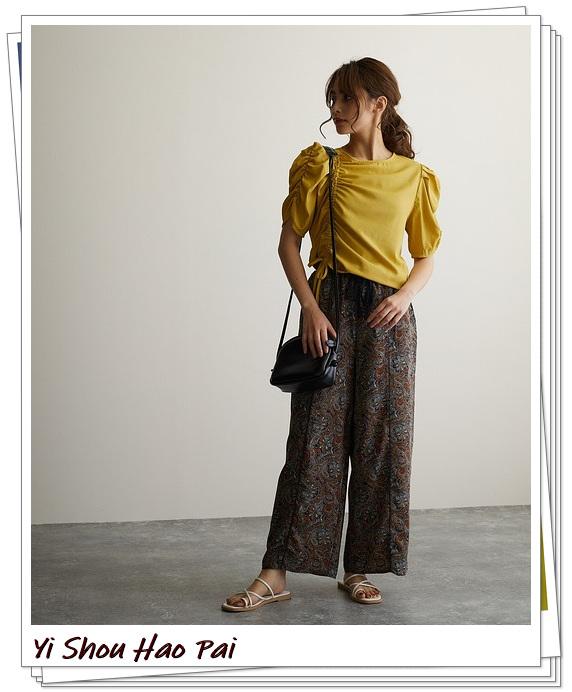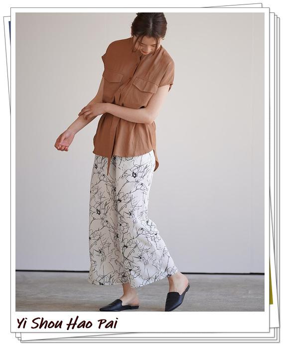 拥有一种即使在裤装造型中也能产生女性气质的花朵图案裤子,在夏天会很吸引目光。选择了流行的绿色,时尚效果翻倍。