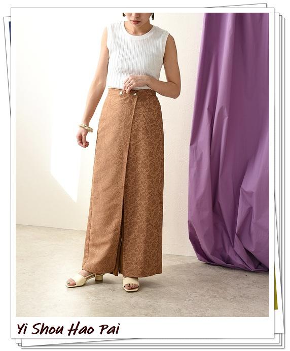 一种类似轻熟女人的夏季穿搭,颜色相似。下装具有舒缓的佩斯利图案,使简单的棕色上衣看起来时尚。