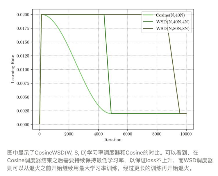 比如模型最关键的超参数——学习率并不会因为规模扩大而大幅度改变,比如在损失函数与 token 数变化的研究上,挑战了 OpenAI 提出的不消耗过多步数的策略,转而追求最少 token 量;比如在学习率调度器上推翻了现在最主流的 Cosine LRS,提出了在学习过程中初期表现略差于 Cosine LRS 但后期会实现 " 反超 " 从而整体更优的 WSD 调度器。