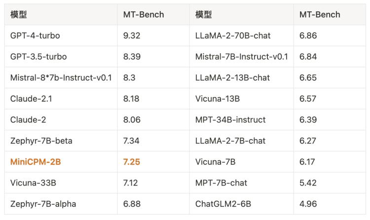 经过 DPO 后,MiniCPM 在当前最接近用户体感的评测集 MTBench 上,MiniCPM-2B 也超越了 Llama2-70B-Chat、Vicuna-33B、Mistral-7B-Instruct-v0.1、Zephyr-7B-alpha 等众多代表性开源大模型。