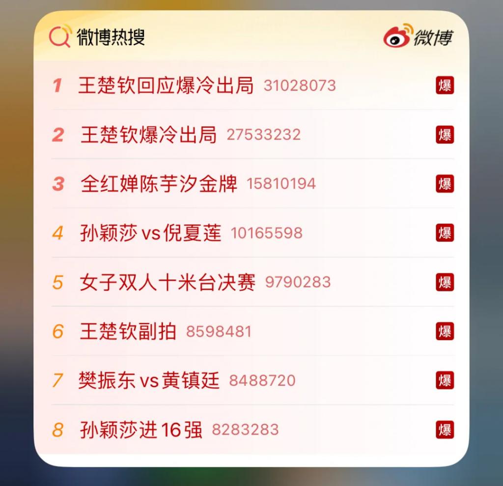 7 月 31 日,中国男单头号选手王楚钦不敌瑞典选手莫雷高德,止步 32 强,相关内容再次引爆微博。这次爆冷实属意外,在以前乒乓球的 16 强赛都没什么人关注,因为大家默认中国最优秀的选手一定能进决赛。