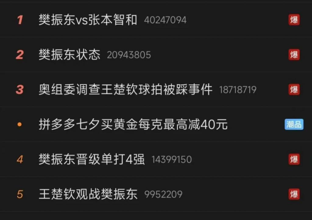 王楚钦失利后,中国男单完全寄希望于樊振东。8 月 1 日,樊振东与日本选手张本智和鏖战 7 局,战胜对手,有惊无险地进入下一轮。观众对于这局比赛的巨大讨论量,将樊振东推至热搜。