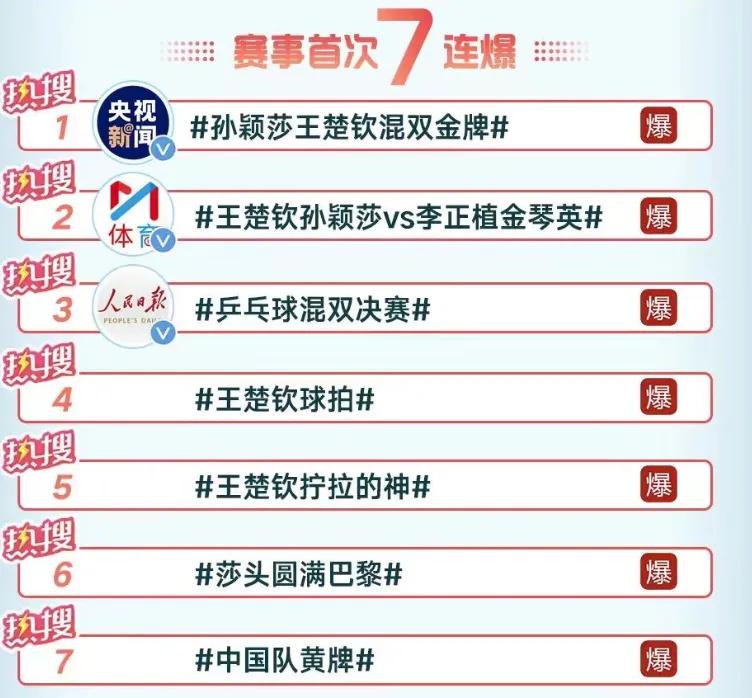 7 月 30 日," 莎头 " 组合战胜对手,获得金牌。当晚相关内容频繁登上微博热搜,获得赛事首次 7 连爆。