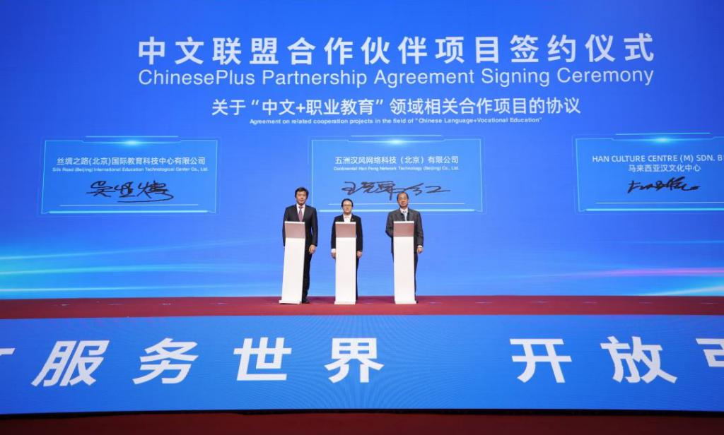在大会上,中外嘉宾共同见证中文联盟 - 五洲汉风网络科技(北京)有限公司与民生教育集团旗下丝绸之路(北京)国际教育科技中心有限公司、马来西亚汉文化中心等 16 家单位签署合作协议。