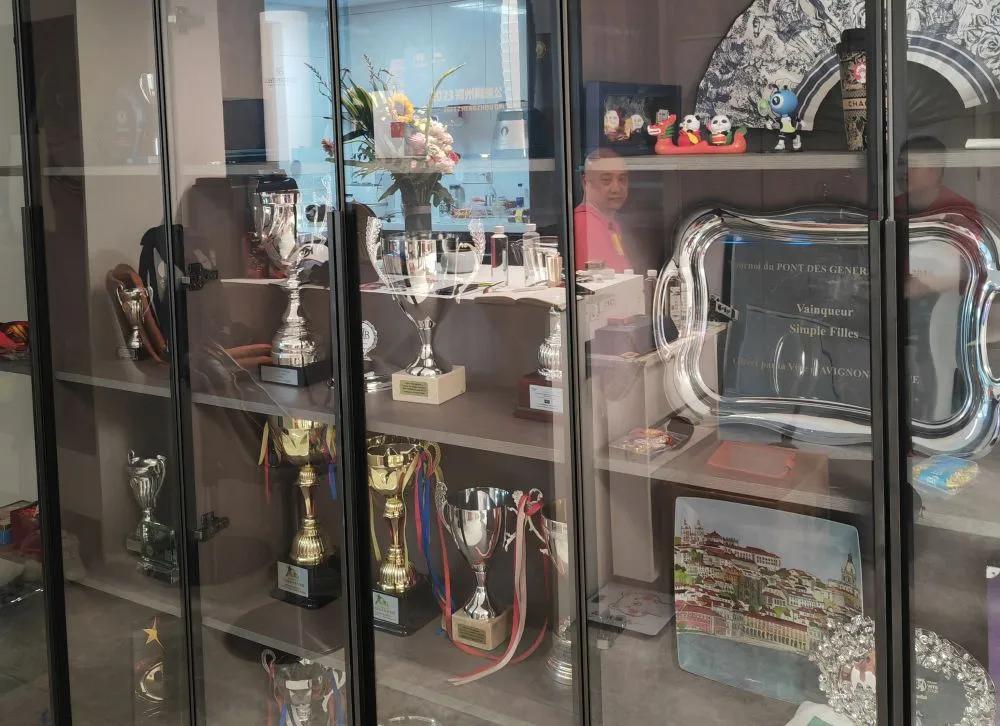 敲开房门,穿着红色短袖的郑建坪笑声爽朗。衣服正中,是巨大的单词 "CHINA"(中国)。他的右侧,是一面摆满奖杯的玻璃荣誉柜。高高低低的冠军奖杯,见证了郑钦文从 9 岁到 21 岁的众多重要时刻。