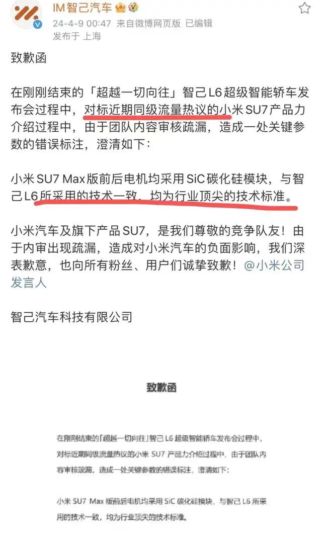 在智己 L6 的发布会上,智己汽车 CEO 刘涛本想把 " 雷氏对比法 " 活学活用,没想到却标错了小米汽车的参数,直接惹得对方连发三条问责微博,自己品牌还得灰溜溜的公开致歉。